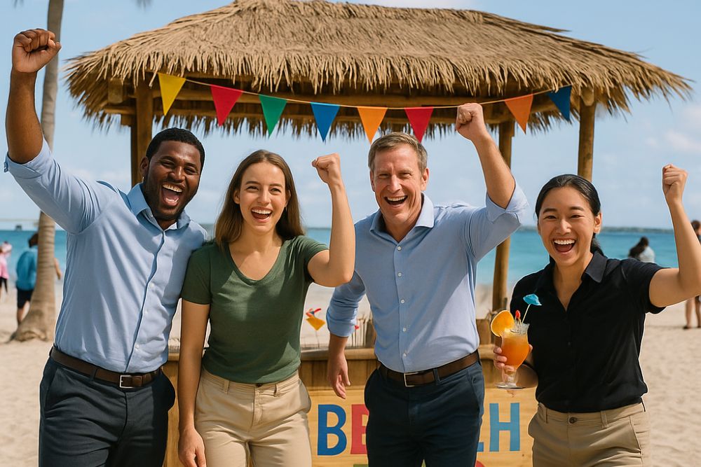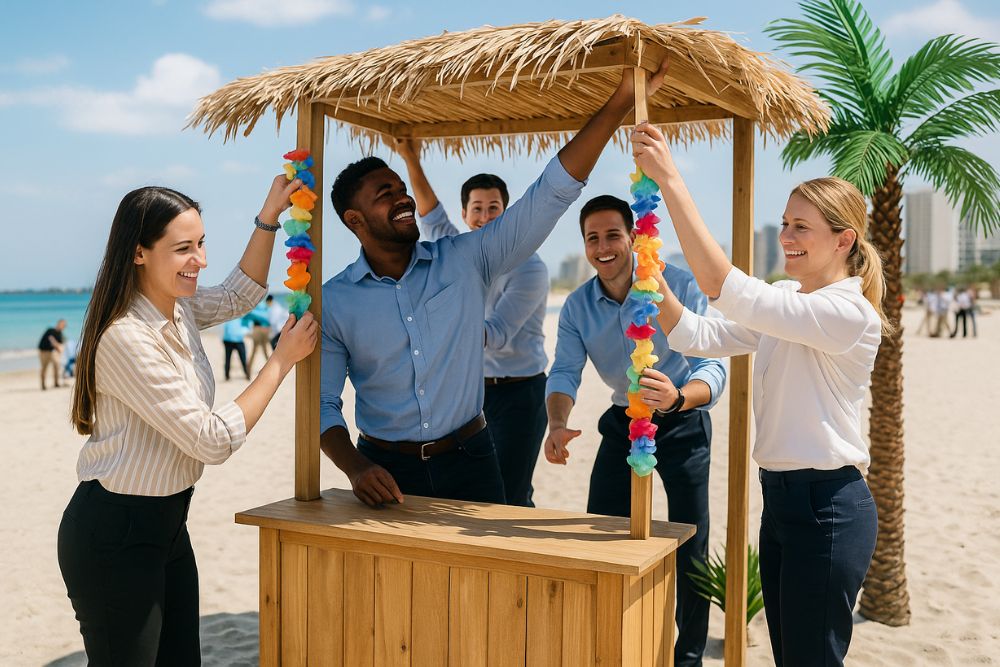 Teams receive their theme, materials, and goals—design a beach bar, craft a signature cocktail, and wow with décor and beachy experiences. Creativity, collaboration, and a splash of fun are key.