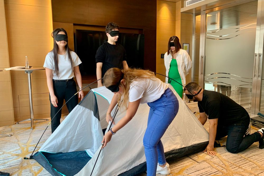 Each team is briefed: half the members will be blindfolded while the others guide them to pitch the tent. Clear communication and calm instructions will be key to making it work.